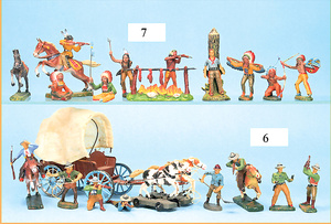 ELASTOLIN, Cowboys, Masse, 7,5 cm, 2 Reiter, 8 Figuren kämpfend, 1 Bauer mit Schippe, dazu 1 Planewagen, 2 Masse-Zugpferde, meist Zust. 2 - 3