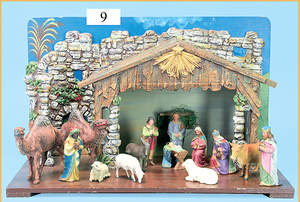 ELASTOLIN, Krippe, Holz/Masse, Grundplatte 50 x 31 x 31 cm, mit Figuren, wie einige Tiere, Zust. 1 - 2