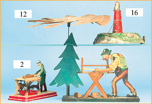Mann an der Säge, wohl ERZGEBIRGE, Holz, mit lithogr. Papier beklebt, Papierflügel oben muß neu befestigt werden, 37 cm