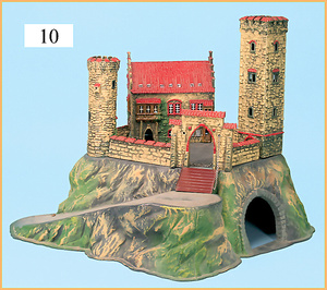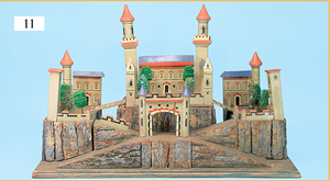 gr. Burganlage, 86 cm breit, 45 cm tief, 65 cm hoch, Türme, Gebäudeteile, 2 Zugbrücken, Holz, handlackiert, bis auf kl. Teile schöner Orig.-Zust., Manufakturarbeit, um 1900