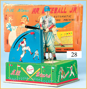 Baseball-Spieler, Japan, Batterieantrieb, Blech lithogr., 15,5 cm breit, 18,5 cm hoch, guter Zust., im Orig.-Kart., Deckel des Kart. Fehlt