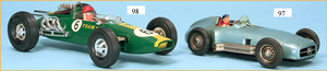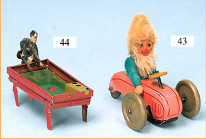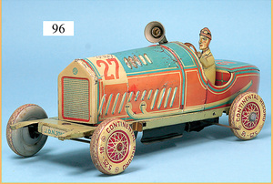DISTLER, Rennwagen, Blech lithogr., mit Fahrerfigur, Litho etwas ausgeblichen, mit auflithogr. Auspuff, altersbedingte Lackfehler, Druckstellen auf der Motorhaube