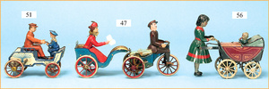 Frau mit Kinderwagen, 15,5 cm, Blech lithogr., mit sich bewegendem Kind u. Stimme, ca. 1910, sehr schöner Orig.-Zust., ausgef.