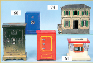 3 Spardosen, 1x blau, gemarkt Deutsche Bank, 1x orange, mit 3-facher Zahlenkombination u. 1x grün/gold, mit leichten Lackfehlern