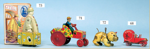Clownwagen, Mathilda, Made in England, mit Fahrerfigur, Blech lithogr., lustige Fahrbewegungen, Uhrwerk intakt, 11 cm