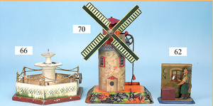 BING, Dampfmaschinenantriebsmodell, Windmühle mit Wasserbecken u. Schöpfrand, 32 cm, teils lithogr., teils handlackiert, Kette muß neu eingehängt werden, Flügel der Mühle vorne 1x neu verlötet, sonst schöner Orig.-Zust., mit kl. altersbedingten Lackfehlern