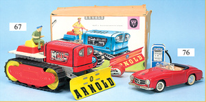 ARNOLD, Raupenschlepper, Blech lithogr., Batterieantrieb, nahezu unbespielt, im Orig.-Kart., mit Anleitung, mit Fahrerfigur, Kart. Verschlissen
