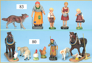 ELASTOLIN, 3 Teile Hänsel u. Gretel mit Hexe, Masse, 10 cm, dazu 1 Wolf, 1 Magd, 9,5 cm, Zust. 2, Riss am Hals der Magd