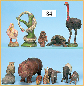 ELASTOLIN, Masse, Schlange auf Baum, Schildkröte, Strauß, Eule auf Stein, Affe, Hase, Hund, Ameisenbär, LINEOL, meist Zust. 2 - 3, einige beschädigt