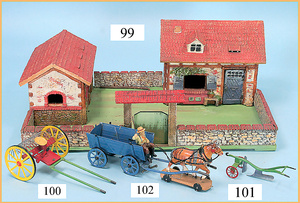 ELASTOLIN, Bauernhof, 36 cm breit, 56,5 cm tief, 21 cm hoch, Holz/Masse, Vorkrieg, 1 Schornstein fehlt, schöner Orig.-Zust., unberührter Dachbodenfund