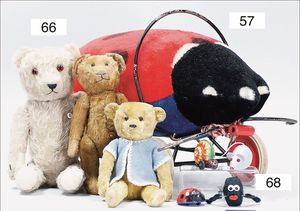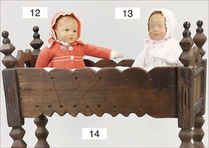 SCHILDKRÖT Baby, 1925, gemarkt 26, braune, fest eingesetzte Glasaugen, Stelle am Hinterkopf geklebt, untersch. Handhaltung, Farbabrieb auf der Nasenspitze, altersbed. Farbabplatzer, Länge 13 cm, dazu kleiner Blech-Puppenstubenwagen