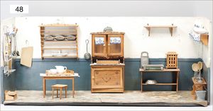 Puppenküche, Holz, bemalt, Länge 99 cm, Höhe 40 cm, Tiefe 41 cm, mit Holzmobiliar, wohl neuer, einige Teile Porzellan, 2 Wandhalter, Blech, einige Besteckteile