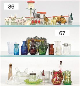 Puppenstuben-Ausschmückungsteile, Zinn, Kaffeekanne, Milchkanne, Tasse, dazu 2 Mörser, Messing, 1 Suppenterrine, Blech emailiert, Sauciere, Schale für Salz und Pfeffer