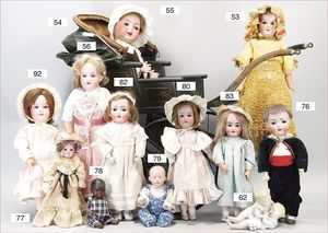 HEUBACH KÖPPELSDORF Porzellankopf-Puppe, gemarkt 342.7 Germany, blaue Schlafaugen, offner Mund, 2 Zähne oben, Zunge, Echthaarperücke, etwas Perückenpull, auf Masse-Sitzbabykörper, mit abstehendem Zeh, 56 cm