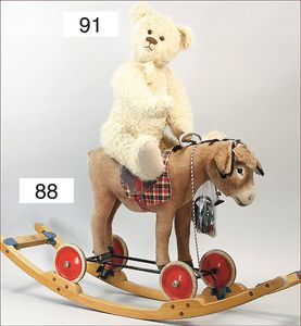STEIFF Esel auf Rädern, Sitzhöhe 50 cm, auf Holzschaukel montiert, mit STEIFF-Zeichen, Nr. 9850