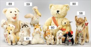 3 x LEHMANN, Tiere, 2 x Blech, Aufschrift Noli 915 und Lili 901, 1 x Maus, Kunststoff, Nr. 935, 1 x Kunstplüsch-Überschlagtier, Aufziehmechanismus intakt