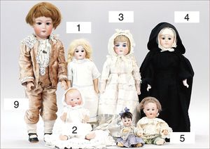 Fundkiste, kl. Puppenstubenwagen, Zinn, 8 cm, mit 3 kl. Porzellanpüppchen, kl. Badepuppe, 11 cm, Junge, Porzellan-Spardose, Nr. 12962, Porzellanpüppchen mit Haube, kl. Kewpie, 1 Celluloid-Püppchen, modellierte Frisur, bewegl. Arme und Beine, anmodellierte
