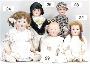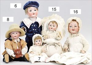2 Porzellankopf-Puppen, 1 x gemarkt AM 390, blaue Schlafaugen, Augenmechanismus hängt, off. Mund, Zähne, Mohairperücke aufgeklebt, auf Masse-Sitzbabykörper, 22 cm, 1 x SIMON & HALBIG 126, braune fest eingesetzte Glasaugen, off. Mund, Zähne, Echthaarperück