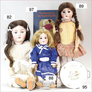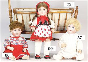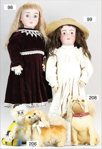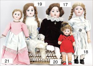 Porzellankopf-Puppe, gemarkt Germany 99/5, blaue Schelmenaugen, off. Mund, 2 Zähne oben, bewegl. Zunge, Nasenlöcher, Echthaarperücke fest aufgeklebt, von außen keine Risse erkennbar, bitte Transportrisiko für den Augenmechanismus beachten, auf Masse-Sitzb