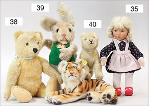STEIFF 2 Teile, Tiger, 1 x mit Knopf, Schild und Fahne, 22 cm, 1 x Knopf, Schild und Fahne fehlen, mit Drahtgelenken, Länge ca. 22 cm