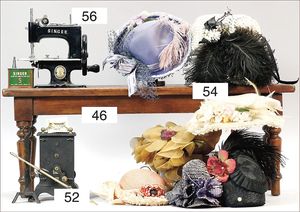 Modeladen, Schränkchen zum Aufklappen, wohl Eigenbau, Maße geschlossen 50 cm x 45 cm, reichhaltig bestückt, mit schönen Hutnadeln, Borten, Hüte, alte Knöpfe, u.v.m.
