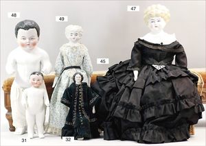 Badepuppe, glasiertes Porzellan, schwarz modellierte Frisur, geschl. Mund, gemalte Augen, 46 cm