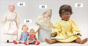 KÄTHE KRUSE Puppe Nr. 8 (Eierkopf), fein gemalte Haare, braune Augen, Pappkopf mit Nessel bezogen, Kopf stellenw. überarbeitet, auf Stoffkörper, Beine mit Scheibengelenken, 35 cm