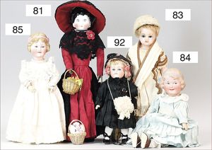 WALTHER & SOHN Porzellan-Brustblattkopf-Puppe, gemarkt 241, blaue, fest eingesetzte Glasaugen, off. Mund, Zähne, Mohairperücke aufgeklebt, etw. Farbabrieb an Stirn, Augenbrauen und Nasenspitze, auf Stoff-Körper, Masse-Arme und -Unterschenkel mit anmodellierten Schuhen u