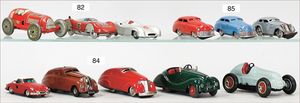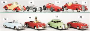 Konv. 3-teilig, Kellermann, Mercedes Rennwagen 383, Biller Rekordwagen, Blech lithogr., 15,5 cm, ohne Antrieb, 1 Rennwagen 50er Jahre, Blech lithogr., Uhrwerk intakt, bespielt, 14 cm