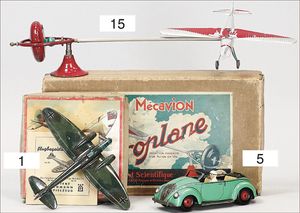 Mécavion Flugkreiselspiel, Frankreich, mit Anleitung, im Orig.-Kart., bespielt, altersbed. Lackfehler