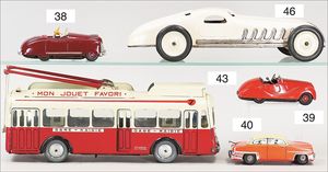 JUSTRA Oberleitungsbus, Frankreich, Blech lithogr., 38 cm, Uhrwerk mit Klingel intakt, sich bewegende Scheibenwischer, 2 beleuchtete Frontscheinwerfer, Abdeckung am Batteriefach fehlt, leicht bespielt, guter Zust.
