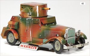 MÄRKLIN Baukastenauto, Panzerwagen, schwere Blechausführung, Mimikry lackiert, 37 cm, Uhrwerk intakt, jedoch schwergängig, bis auf kl. ausgebesserte Stellen schöner Orig.-Zust.