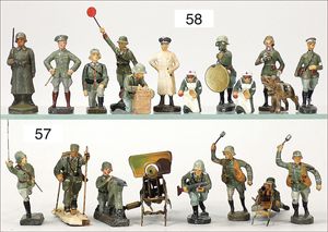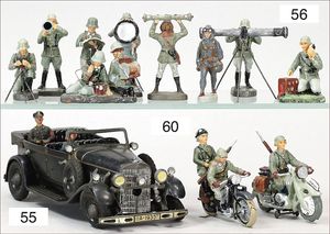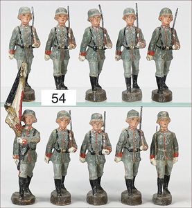6 Teile SA, Lineol und Elastolin, Fahnenträger, Fackelträger, Musiker, marschierend, 2 SS Figuren marschierend, dazu 2 Panzerführer, sowie 2 Figuren kämpfend, Zust. 2-3