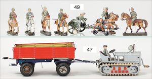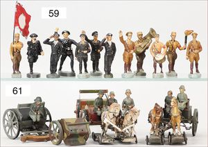 Planewagen mit 2 Zugpferden, kl. Serie, ohne Plane, sonst guter Zust., 8 Figuren, meist Lineol, 1 Motorradfahrer, Wehrmacht, Musiker, Fahnenträger, dazu 2 Franzosen