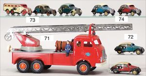 GAMA LKW, 3-achsig, Feuerwehr, 31 cm, Kunststoff, Drehleiter, 2 Figuren, Friktionsantrieb intakt, guter Zust.