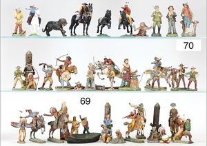 8 Teile meist Elastolin, Masse, Trapper und Indianer, reitend, dazu ca. 20 Teile Trapper und Indianer kämpfend, Lagerleben, Marterpfahl, Totenpfahl, Zust. 3, 2 Holzboote