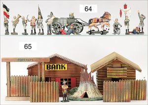 Konv. bestehend aus Blockhütte, Zaunteile, Bankgebäude, 1 Indianerzelt, Elastolin, Masse, Baumspitze fehlt, 1 Figur Siedler, Elastolin, Masse, 7,5 cm, im Orig.-Kart.