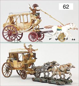 ELASTOLIN Kunststoff, Postkutsche mit 4 Masse-Zugpferden, Lackfehler an den Zugpferden, sonst bespielt, bis auf kl. Stellen gut, dazu 1 Postkutsche Kunststoff, 29 cm, guter Zust.