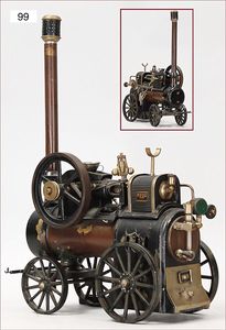 MÄRKLIN 51/53, ca. 1913, fahrbares Lokomobil, 34 cm, Kesseldurchmesser 7 cm, Schwungrad-Durchmesser 12 cm, Schornstein zum einklappen, Wasserstandsglas, Fliehkraftregler, Original-Brenner, Speisepumpe, vordere Radaufhängung 1 x verlötet, sonst Dachbodenfund im Orig.-Zust.