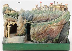 ROCK & GRANER Biberacher Blech, Burglandschaft mit Wasserfontäne und Grotte, Blech, handlackiert, 27,5 x 25,5 cm, Höhe 24,5 cm, schöner unberührter Orig.-Zust. mit kl. altersbed. Lackfehlern, Dachbodenfund