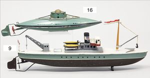 U-Boot, Blech, handlackiert, Vorkrieg, Gewicht unten sowie Maschinengewehr fehlen, bespielt, kleine Druckstellen, Verschlussschraube klemmt, Uhrwerk kann nicht geprüft werden, 25 cm