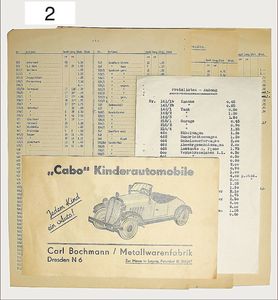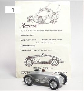 KARL BOCHMANN Metallwarenfabrik Dresden, Rennauto, Stromlinienform, Uhrwerkantrieb, Gummi bereift, Uhrwerk intakt, mit Orig.-Prospekt, 16 cm