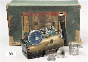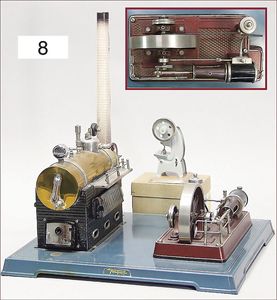 MÄRKLIN 402, Verwandlungsmotor, Dampfmaschine, stehend, liegend oder fahrbar verwendbar, mit Brenner und Schornstein, ohne Räder, im Orig.-Karton, bespielt, Kesseldurchmesser 7 cm