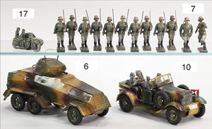 LINEOL 7,5 cm, Masse, 2. Weltkrieg, 12 Musiker marschierend, 5 Reiter, Zustand 3-, einige Figuren schlechter