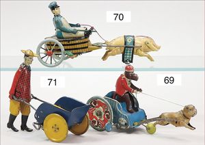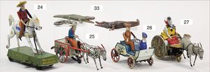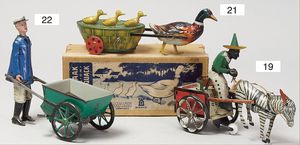 LEHMANN Clown auf Eselwagen, Blech lithogr., 19 cm, Spiralfederwerk intakt, guter Zust. mit kleineren Spielspuren