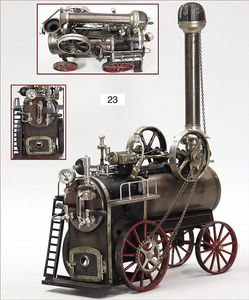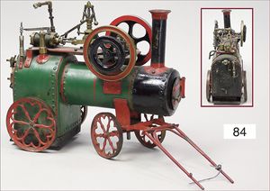 fahrbares Lokomobil, 27 cm, Blech, Guß- und Messingteile, Rauchkammertür zum Öffne, vorne Deichsel, um 1910, ausgefallen