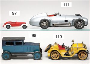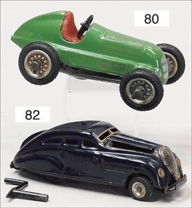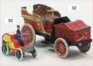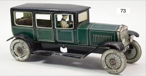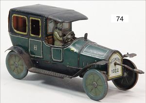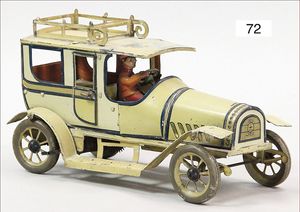 Ebo Automobil, ca. 1920, 27 cm, Blech, teils lithogr., teils handlackiert, mit Fahrerfigur, Spiralfederwerk defekt, Lackfehler am Dach, Orig.-Zust.