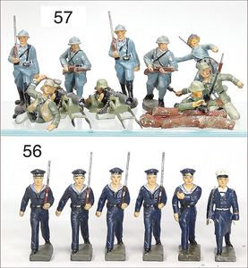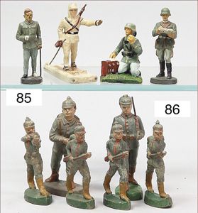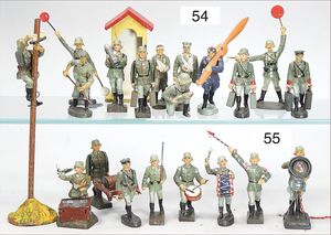 Konv. 2. Weltkrieg, Masse, 7,5 cm, 1 Mann am Telegraphenmast hängend,1 Mann mit Brieftaube, 2 Figuren Kabeltrommel tragend, Elastolin und Lineol, Elastolin Mann mit Scheinwerfer, dazu 2 Musiker Elastolin und Lineol, 1 Mann mit Taktstock, Lineol, 1 Figur marschierend, Zustand 2-3