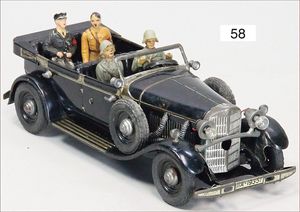 TIPP & CO. Führerwagen, Mercedes 770K, 23 cm, Uhrwerkantrieb mit Kardanwelle intakt, 2 beleuchtete Frontscheinwerfer, seltene Ausführung, Stern liegt lose bei, mit 4 Mann Besatzung, leicht bespielt, guter Zust.