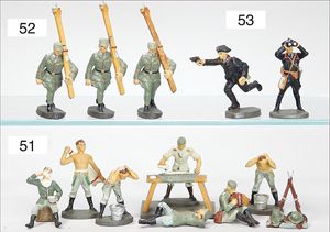 ELASTOLIN 2. Weltkrieg, 7,5 cm, Masse, Reichsarbeitsdienst, Mann mit Schippe, Zust. 3-, 1 Pilot Rotorblatt tragend, wohl farblich überarbeitet, 9 Figuren Elastolin und Lineol, 2 Verwundete, 2 Männer mit Kelle, Figuren Munitionskisten tragend, Mann mit Granate, Zust. 2-3, dazu 1 Wärterhäusschen, guter Zust.